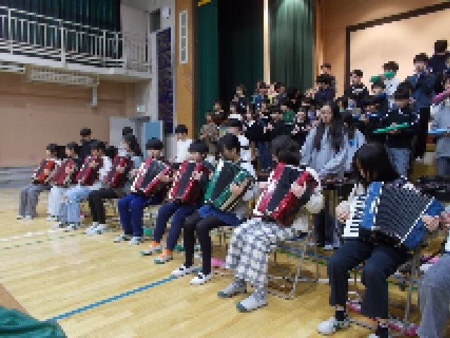 6年生は、お礼に合奏を披露しました。体育館全体が、6年生の卒業を祝うあたたかい雰囲気に包まれていました。