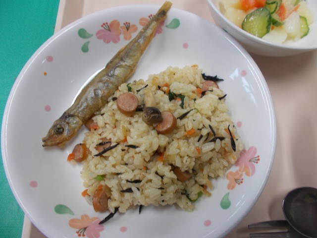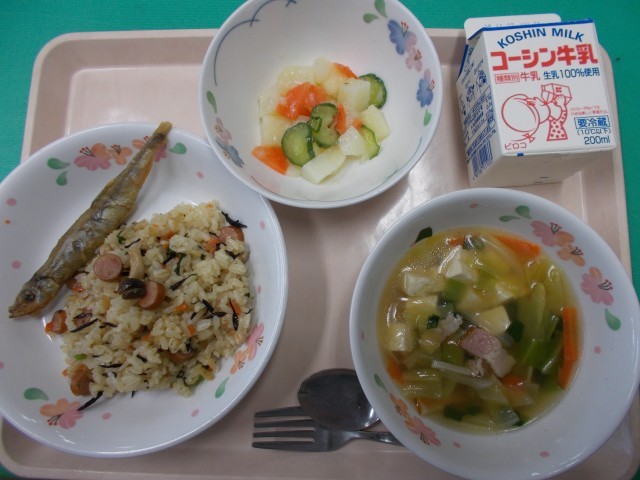 ひじきの和風ピラフ、ししゃものカレー揚げ、ポテトサラダ、ベーコンと野菜のスープ、牛乳です。