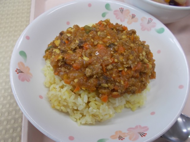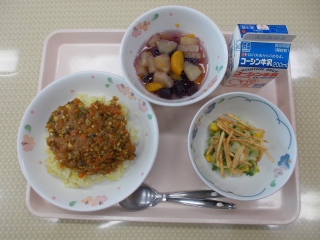 今日の給食のメニューは、ドライカレー、フレンチポテトサラダ、ぶどう寒天ポンチ、牛乳です。ドライカレーは、豚ひき肉と野菜をよく炒めて作っています。味付けは、数種類のスパイスを組み合わせていて、ターメリック、ガラムマサラ、カレーパウダーが入っています。スパイスの辛み成分には、食欲を増進する効果があります。風邪をひきやすい季節です。よく食べ、よく寝て、今週も元気にがんばってほしいと思います。
