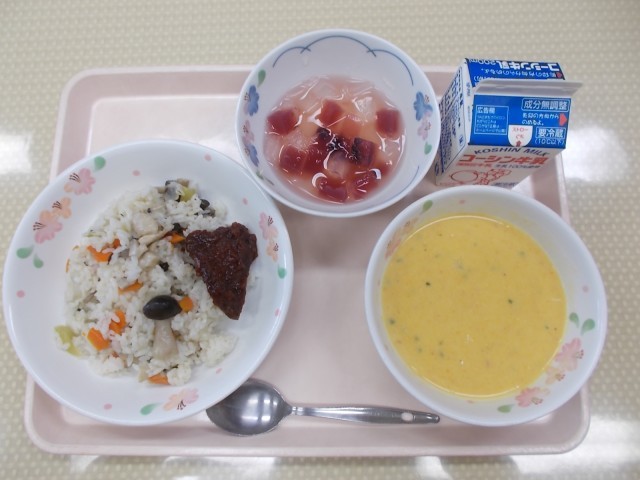 今日の給食のメニューは、きのこピラフ、レバーのマリアナソース、にんじんのポタージュ、ブルーベリーポンチ、牛乳です。今日は、目の愛護デー献立です。明日の10月10日は、目の愛護デーです。10を横に倒すと目とまゆの形に見えることからこの日になったそうです。50年前頃に失明予防の運動として始まりました。今日の給食には、目によい食べ物がたくさん使われています。(レバー、にんじん、ブルーベリー)目の愛護デーを目の健康について考える機会にしたいですね。