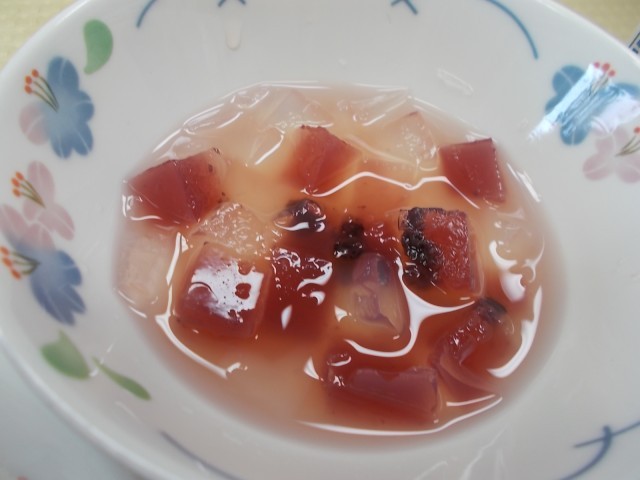 今日は、十五夜献立です。メニューは、けんちんうどん、焼きしししゃも、ツナと枝豆のごま和え、みたらしだんご、牛乳です。今日は十五夜で、1年で1番月がきれいに見える日と言われています。また、「中秋の名月」とも言います。十五夜に合わせて、給食室で「だんご」を作りました。しょうゆと砂糖でたれを作る「みたらし味」です。今晩は曇りの予報が出ています。中秋の名月を見ることはできるでしょうか。