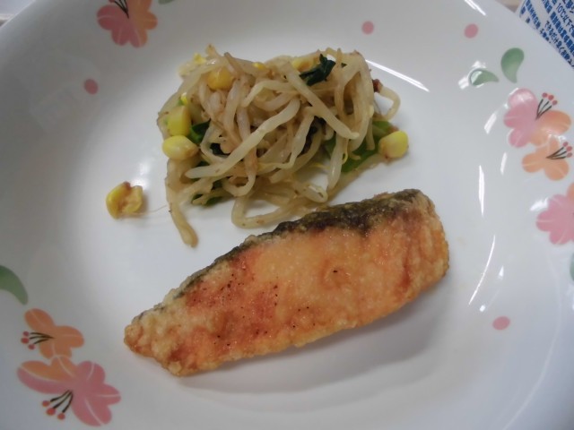 今日のメニューは、子ぎつねご飯、鮭のレモン醤油かけ、もやしのおひたし、じゃがいもと豆腐の味噌汁、みかん、牛乳です。