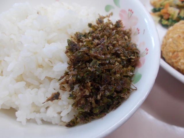 今日の給食のメニューは、ごはん、エコふりかけ、小松菜コロッケ、小松菜のごま和え、豆腐のみそ汁、牛乳です。今日は「SDGs献立」です。江戸川区では、誰もが安心して自分らしく暮らせるようにSDGsの取組を行っています。今日は、給食を通してSDGsについて考えてもらおうと、SDGsを意識した給食を作りました。 ①エコふりかけ~みそ汁のだしに使った「かつお節」を再利用して作りました。だしをとったかつお節を細かく刻んで、炒めて作ります。 ②小松菜コロッケ・小松菜のごま和え~地域のものを地域で消費することを「地産地消」といいます。今日の「小松菜コロッケ」と「ごま和え」に江戸川区でとれた小松菜をたくさん使いました。地域でとれたものを食べることは、地域の活性化や輸送で発生する二酸化炭素の削減など環境を守ることにもつながります。 ③食の安全と栄養バランス~給食では、栄養バランスが考えられた食事をみんなが平等に食べることができます。