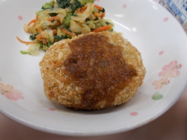 今日のメニューは、ご飯、豆腐と小松菜のハンバーグ、野菜の土佐醤油和え、わかめの味噌汁、ぶどう、牛乳です。