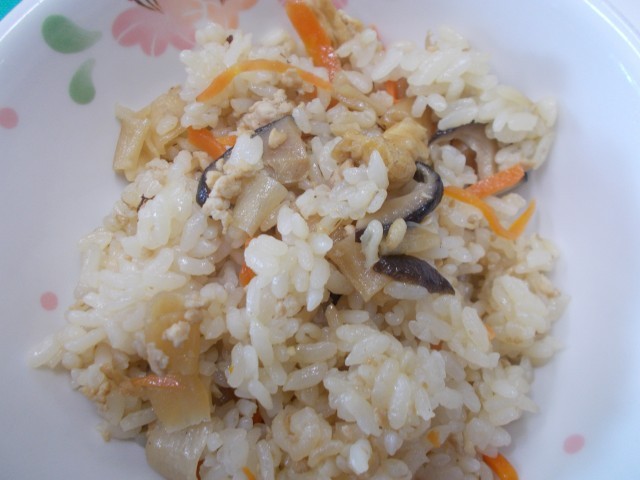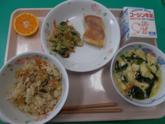 今日のメニューは、かんぴょうの炊き込みご飯、赤魚の塩こうじ味噌焼き、ごま和え、湯葉入りかきたま汁、みかん、牛乳です。