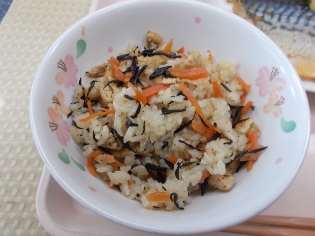 今日は、和食の日献立です。メニューは、きのこおこわ、サワラのおろしポン酢かけ、小松菜とじゃこのおひたし、さつまいものみそ汁、みかん、牛乳です。11月24日は「和食の日」として、和食文化国民会議で定められています。和食の味の基本は、「だし」のうま味です。「だし」とは、昆布やかつお節などを煮出した汁の事です。水やお湯を使ってうま味を引き出します。今日の給食では、きのこおこわには、昆布だし、おひたし、みそ汁には、かつお節を使いました。和食のうま味を味わっていただきました。