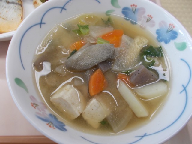 今日の給食のメニューは、ひじきごはん、さばの辛味焼き、小松菜とちくわの和え物、豚汁、牛乳です。12月の給食目標は「寒さに負けない体をつくりましょう」です。豚汁に入っている「ねぎ」や「ごぼう」などの冬が旬の野菜には、体を温める効果があります。また、温かい料理や「しょうが」や「とうがらし」などの辛い食べ物を食べることで体が芯から温まりポカポカになります。給食を残さず食べて、外遊びで体を動かし、丈夫な体つくりを心がけてほしいと思います。