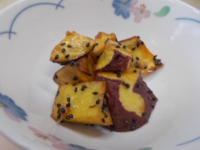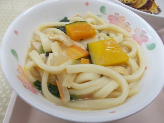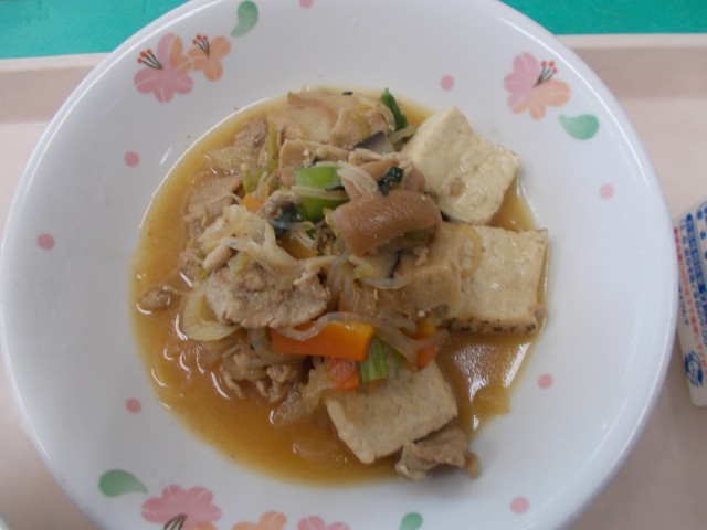 今日の給食のメニューは、ほうとう、イカの生姜焼き、じゃこ入りわかめサラダ、大学芋、牛乳です。今日は、山梨県の郷土料理「ほうとう」を作りました。みそ味の汁の中に冬の野菜、大根やかぼちゃなどと一緒に煮込んで作ります。山梨県は山が多く、米を作るのが難しいので、昔は麦を栽培していました。小麦粉でほうとうを作り、家庭でよく食べていたそうです。今は、観光の人向けにほうとうのお店がたくさんあります。