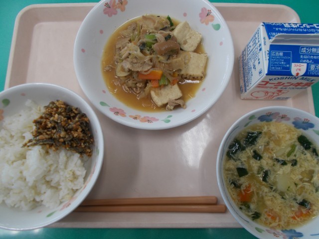 今日のメニューは、麦ごはん、いりこアーモンド、豚すき、かきたま汁、牛乳です。
