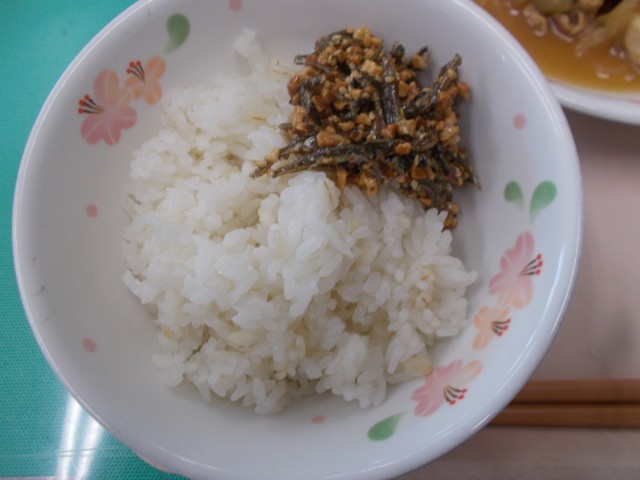 今日の給食のメニューは、わかめごはん、白身魚のさざれ焼き、かわりきんぴら、厚揚げのみそ汁、みかん、牛乳です。最近、寒くなってきて、牛乳の残りが多くなってきたようです。牛乳に多く含まれている「カルシウム」は、骨や歯を丈夫にする栄養素です。成長期は体が大きくなる途中なので、骨の材料になるカルシウムがたくさん必要になります。今日は他にも白身魚の「ホキ」、厚揚げや小松菜にもカルシウムが多く含まれています。カルシウムをしっかりとって、丈夫な骨を作ってほしいと思います。
