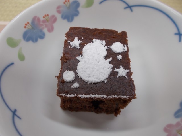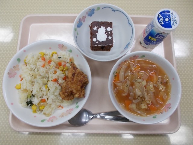 今日の給食のメニューは、コーンのピラフ、フライドチキン、ミネストローネスープ、ココアケーキ、ジョア(プレーン味)です。今日は「クリスマスメニュー」です。クリスマスパーティーをイメージして、カラフルな「コーンのピラフ」と「フライドチキン」、サンタクロースの赤色をイメージした「ミネストローネスープ」を作りました。ココアケーキは、給食室手作りです。雪をイメージして、粉砂糖をかけました。2学期最後の給食は、心がウキウキするメニューでした。今日もおいしくいただきました。
