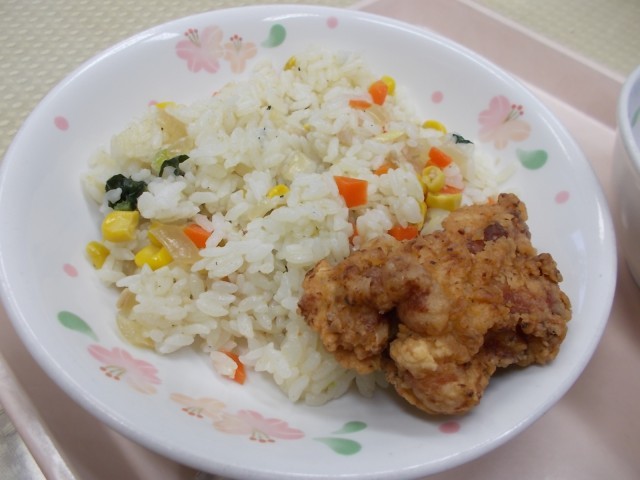 今日の給食は、秋田県の郷土料理献立です。メニューは、小松菜きつねごはん、めひかりの唐揚げ、ツナと野菜のごま和え、だまこ汁、牛乳です。秋田県は、東北地方の北西部にあり、日本海に面しています。秋田県は何と言ってもお米が有名で、全国6番目の生産量です。「あきたこまち」などのブランド米もあります。その他の特産物には、「はたはた」「せり」「比内鶏」「りんご」などがあります。今日の給食では、特産物の「はたはた」を出したかったのですが、今年はあまりとれていないため、出せませんでした。代わりに愛知県産の「めひかり」にしました。「だまこ汁」~だまこ汁の「だまこ」は、炊いたお米をすりつぶして丸めて作ります。「きりたんぽ」と似た食べ物です。「だまこ」はお手玉のことで、お手玉のように丸めて作ることから名前がつきました。鶏のだしにせりやねぎなど秋田のおいしい野菜を加えて煮ます。今日は、ごはんをつぶし丸めてからオーブンで焼いて作りました。周りはカリッと中はもっちりしています。