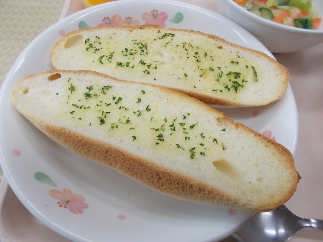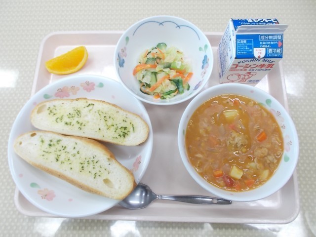 今日の給食のメニューは、ガーリックフランスパン、ミートボールシチュー、アーモンドサラダ、オレンジ、牛乳です。今日は、ガーリックトーストに使われている「にんにく」の話です。にんにく特有の強い香りは、「アリシン」という成分です。「アリシン」には、食欲を増進させる働き、疲れをとる働き、体を温める働きなど、良いことがたくさんあります。
