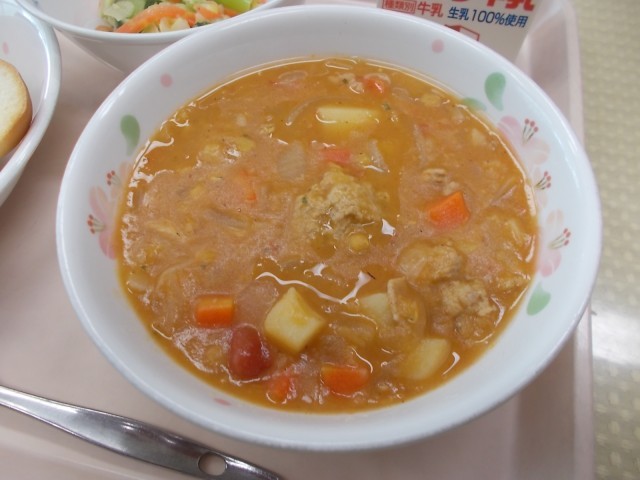 今日の給食のメニューは、ほうとう、イカの生姜焼き、じゃこ入りわかめサラダ、大学芋、牛乳です。今日は、山梨県の郷土料理「ほうとう」を作りました。みそ味の汁の中に冬の野菜、大根やかぼちゃなどと一緒に煮込んで作ります。山梨県は山が多く、米を作るのが難しいので、昔は麦を栽培していました。小麦粉でほうとうを作り、家庭でよく食べていたそうです。今は、観光の人向けにほうとうのお店がたくさんあります。