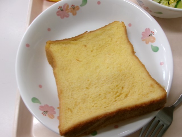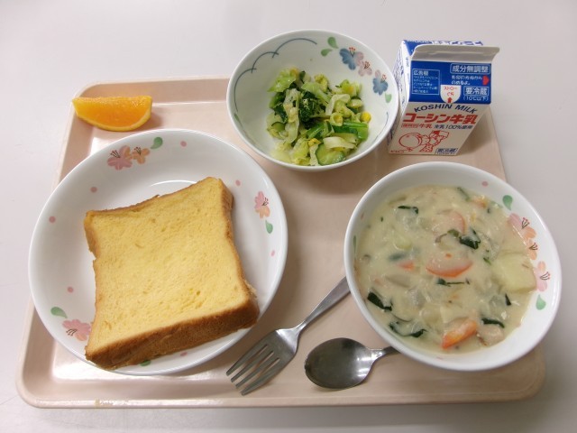 今日のメニューは、メープルフレンチトースト、鮭のクリーム煮、ブロッコリーのグリーンサラダ、オレンジ、牛乳です。