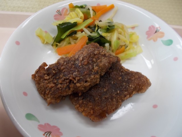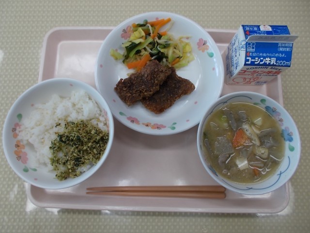 今日の給食のメニューは、ごはん、小松菜のそぼろふりかけ、くじらの竜田揚げ、野菜のポン酢和え、豚汁、牛乳です。今日は、学校給食週間4日目です。今日は、昭和時代の30~40年ごろの給食によく出ていた「くじらの竜田揚げ」を作りました。今は食べることが少ないですが、当時は給食の人気メニューだったそうです。また、肉が高級品であったため、肉の代わりにたんぱく源として食べていたそうです。