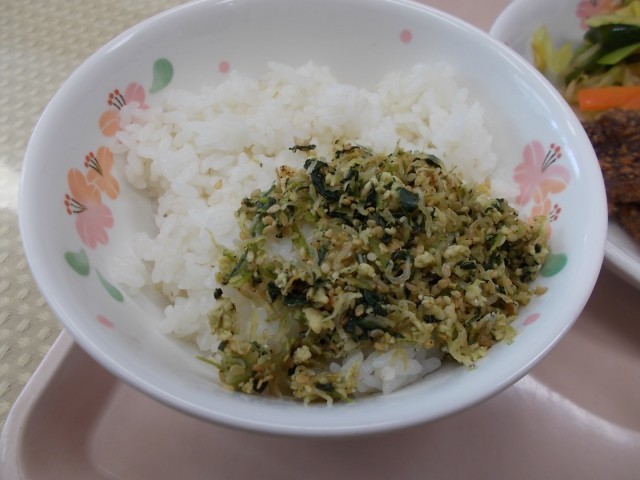 今日のメニューは、ご飯、おかかじゃこふりかけ、赤魚の梅みそ焼き、ひじきのいりこ、きのこのけんちん汁、牛乳です。