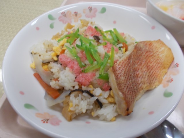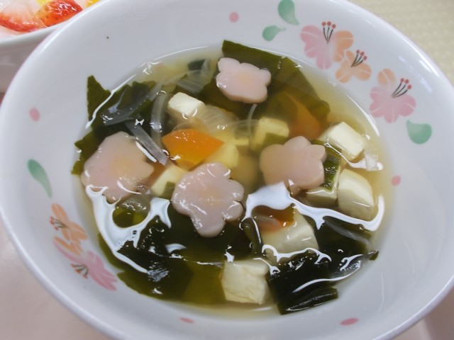 今日の給食のメニューは、ちらし寿司、赤魚の西京焼き、すまし汁、桃とカルピス寒天のポンチ、牛乳です。3月3日はひなまつりです。桃の花が咲く季節で、「桃の節句」ともいわれます。ひなまつりは、女の子の成長と幸せを願う行事で、ひな人形を飾り、はまぐりの潮汁などをいただきます。給食では、ちらし寿司や梅の花のかまぼこが入ったすまし汁を作り、寒天ポンチには、桃の缶詰やカルピス寒天などを入れて、鮮やかな彩りになるようにしました。