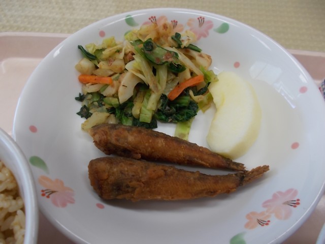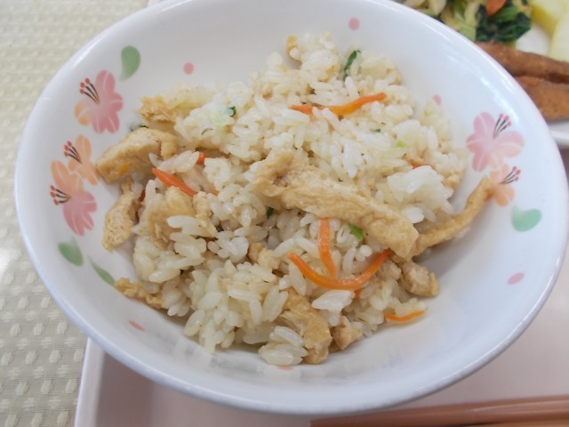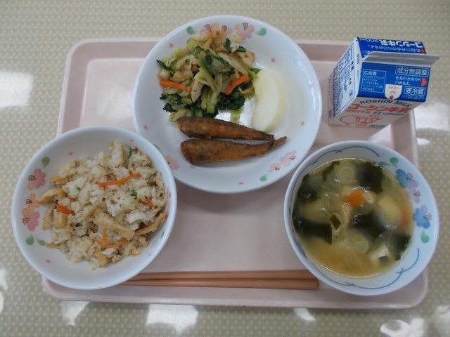 今日の給食のメニューは、こぎつねごはん、めひかりの香味揚げ、小松菜とちくわの和え物、じゃがいものみそ汁、りんご、牛乳です。今日は、きつねの好物と言われている「油揚げ」が入った「こぎつねごはん」を作りました。油揚げは薄く切った豆腐を2回揚げて作られます。料理に使う時は、湯通しするなどして「油抜き」をして使うと、味がしみやすくなります。味がしみた油揚げがたくさん入ったごはんです。