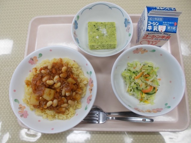 今日の給食のメニューは、チリビーンズライス、コールスローサラダ、小松菜のケーキ、牛乳です。3月の給食目標は、「楽しい給食を過ごせたか考えましょう」です。1年間クラスのみんなで協力して準備や後片付けができたか、自分の仕事に進んで取り組むことができたか、楽しい給食の時間が過ごせたかなどを振り返ります。また、3月はセレクト給食や6年生のリクエスト給食が登場しています。今日の小松菜のケーキも6年生のリクエスト給食です。