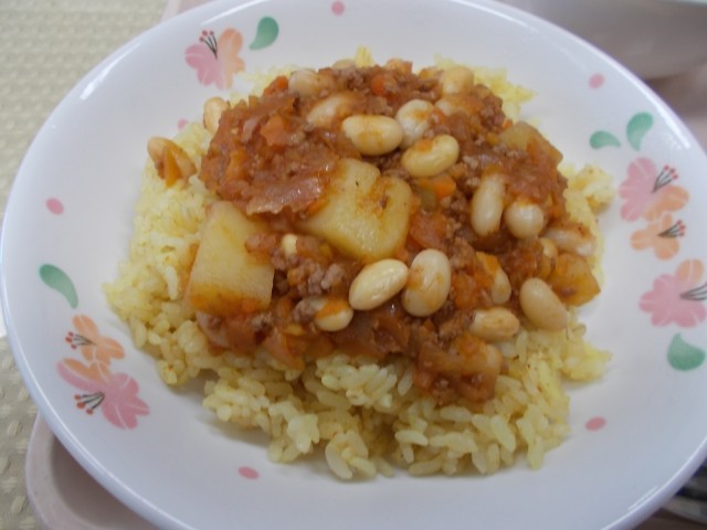 今日の給食のメニューは、ドライカレー、フレンチポテトサラダ、オレンジ寒天ポンチ、牛乳です。今日は、6年生を送る会に合わせて、6年生からリクエストがあったメニューを作りました。ドライカレーは、ひき肉、たまねぎ、にんじん、ピーマンなど、細かく刻んだ野菜をたくさん使って作ります。給食では、大豆を入れているのが特徴です。ごはんには、ターメリックというスパイスとカレー粉を入れて色をつけました。