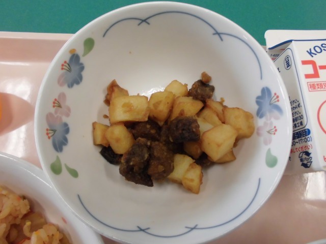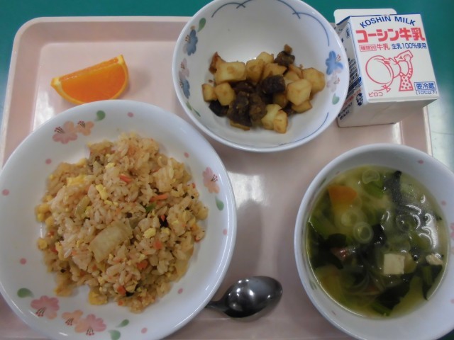 今日のメニューは、キムチチャーハン、レバーとポテトの中華ソース、小松菜と豆腐のスープ、オレンジ(せとか)、牛乳です。