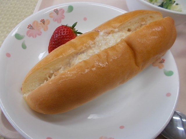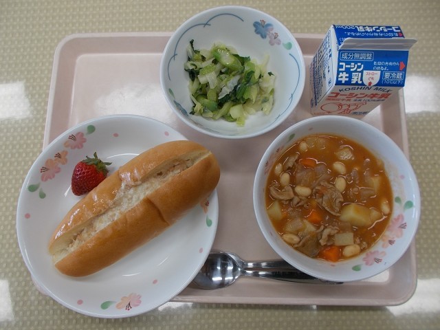 今日の給食のメニューは、ツナドッグ、ポークビーンズ、春野菜のグリーンサラダ、いちご、牛乳です。「春野菜のサラダ」には、春野菜の「アスパラガス」が入っています。アスパラガスの旬は春から夏にかけてで、特に4月から6月が1年で一番おいしい時季です。今日のアスパラガスは、とても甘みが強く柔らかくておいしいです。さらに、病気予防に効果があるカロテンやビタミンC、E、B群が多く含まれています。