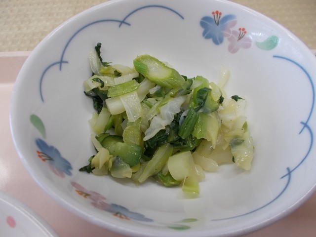 今日の給食のメニューは、ごはん、ひじきのおかかふりかけ、小松菜入りの卵焼き、ごもくきんぴら、春野菜のみそ汁、牛乳です。今日は、春にとれる、にんじん、キャベツ、玉ねぎ、新じゃがいもが入った春野菜のみそ汁を作りました。どの野菜も1年中食べられる野菜ですが、春にとれる野菜は、寒い冬を耐え抜いているので、栄養をたっぷりと蓄えているのが特徴です。