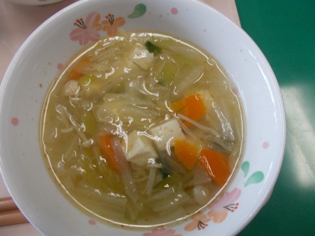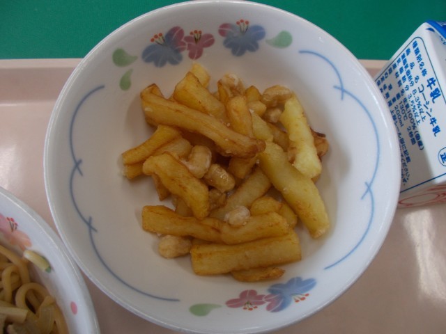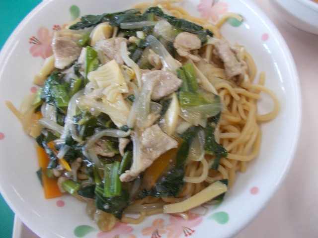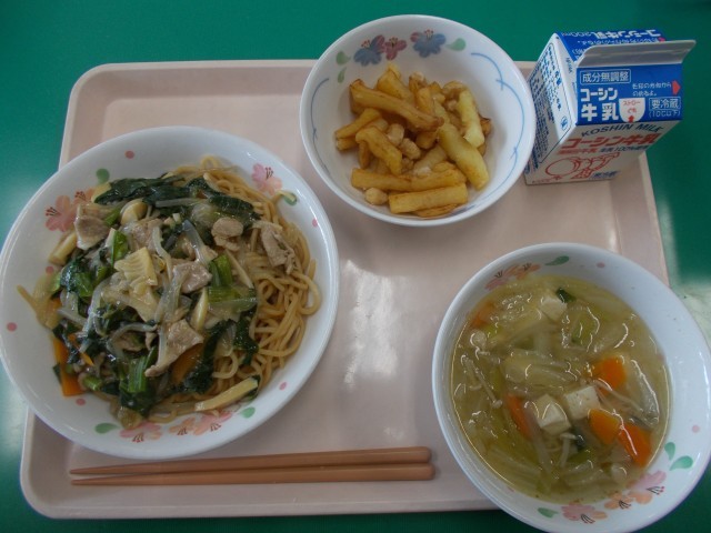 今日のメニューは、小松菜のあんかけ焼きそば、白菜とえのきのスープ、フレンチポテト、牛乳です。