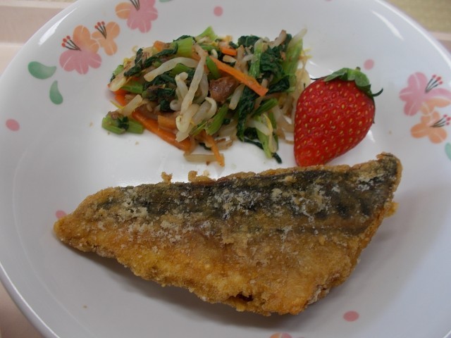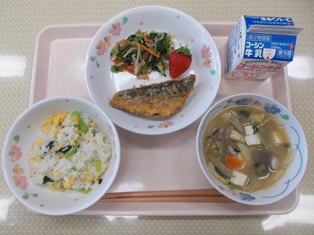 今日の給食のメニューは、小松菜ごはん、さばのカレー揚げ、小松菜のおひたし、豚汁、いちご、牛乳です。今日は小松菜をたっぷり使ったⅼ献立です。江戸川区は、小松菜が東京都で一番とれる場所です。江戸川区は海が近いので、海のミネラルが土へ溶け込んでいます。ミネラルがたっぷり入った土で小松菜を育てると、旨味と甘みが増えると言われています。今日は、ごはんとおひたしと豚汁に小松菜を使いました。シャキシャキとした食感と小松菜の旨味を味わいながらいただきました。
