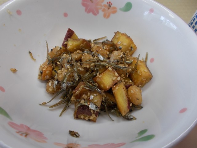 今日の給食のメニューは、豚丼、小魚と大豆とさつまいもの揚げ煮、野菜のポン酢あえ、牛乳です。今日は、小魚に「イワシ」を使いました。イワシは、漢字で書くと魚へんに弱いと書きます。(鰯)なぜ弱いかと言うと、イワシのうろこがとってもはがれやすく、傷がついて傷みやすいことからこの漢字になったと言われています。イワシはとても繊細な魚ですが、イワシからだしをとることができるくらい旨味がたっぷり詰まったおいしい魚です。今日は、イワシを丸ごと全部食べられるように、油で揚げました。
