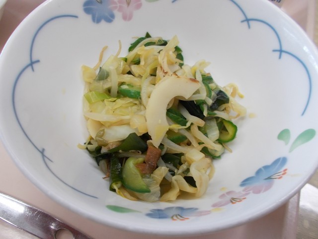 今日のメニューは、小松菜のあんかけ焼きそば、白菜とえのきのスープ、フレンチポテト、牛乳です。