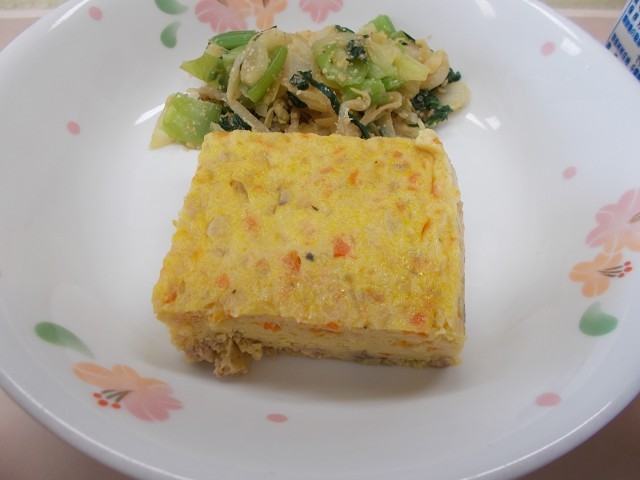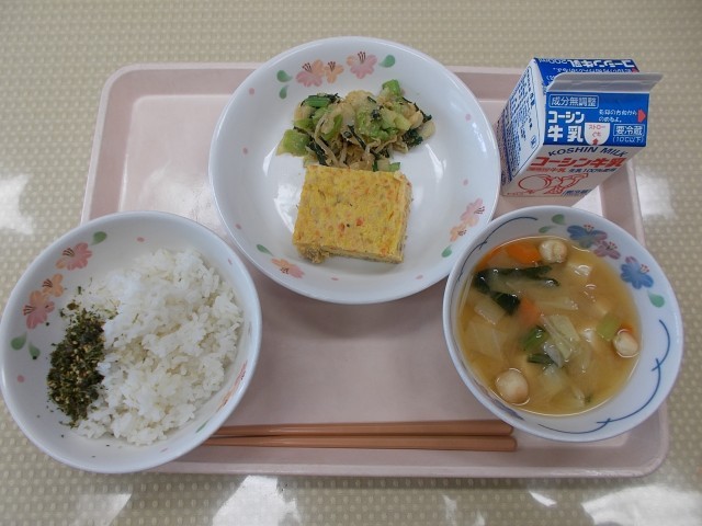 今日のメニューは、たけのこご飯、ししゃものいそべ揚げ、五目きんぴら、かきたま汁、牛乳です。