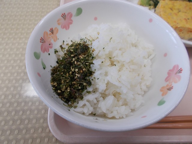 今日の給食のメニューは、ごはん、じゃこふりかけ、厚焼き玉子、小松菜のごま和え、キャベツのみそ汁、牛乳です。今日は、小松菜のごま和えについて紹介します。小松菜は、江戸川区でとれたものを使い、ごまたっぷりの甘辛いたれと合わせてごま和えにしました。ごまは、栄養が豊富な食べ物です。ごまには若返りに効果があると言われている成分が含まれています。世界三大美女のクレオパトラも美しさを保つためによく食べていたそうです。ごまの香りを楽しみながらいただきました。