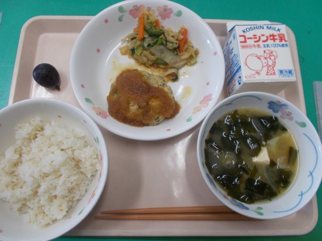 今日のメニューは、ご飯、豆腐と小松菜のハンバーグ、野菜の土佐醤油和え、わかめの味...