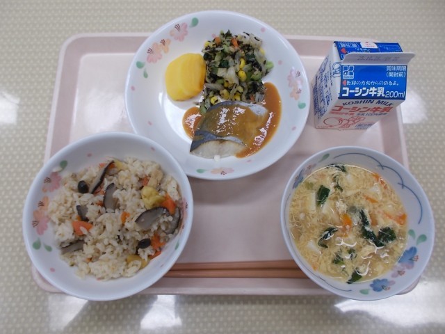 今日の給食のメニューは、秋の香りごはん、さわらの味噌だれ焼き、磯香和え、かきたま...