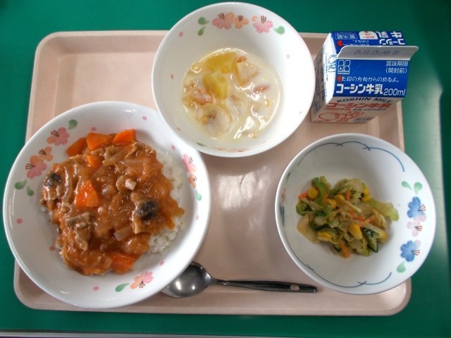 今日の給食のメニューは、ハヤシライス、ごまドレッシングサラダ、フルーツヨーグルト...