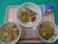 今日のメニューは、レンコンご飯、かつおの竜田揚げ、切り干し大根の胡麻和え、厚揚げ...