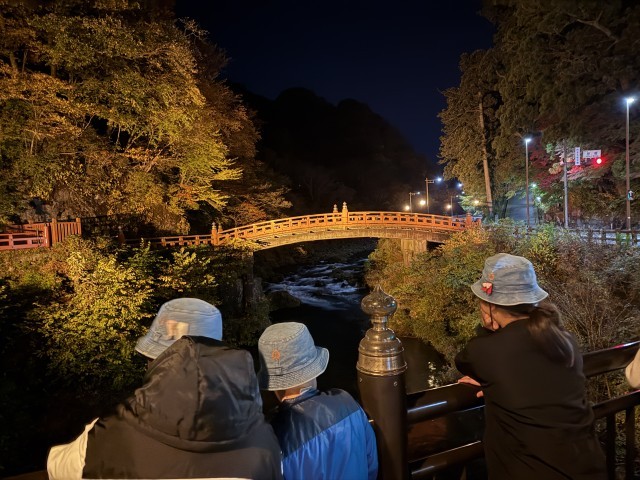 夕食後、ナイトハイクに出かけました。旅館から10分程度歩いて、神橋のそばに到着し...