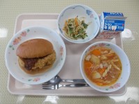 今日の給食のメニューは、フィッシュバーガー、もやしのサラダ、ミネストローネ、牛乳...