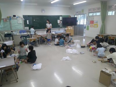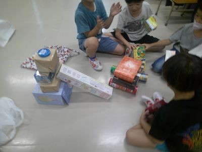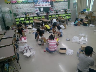 1年生の算数は形遊び。いろいろな形の箱に親しみ、立体への興味・関心を高める活動です。いろいろな箱で「タウン」をつくろうという活動。グループになり夢中で取り組んでいました。