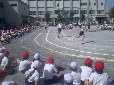 続いて4年生の表現、1,2年生の団体競技、6年生の学級対抗リレーです。団体やリレーでは「がんばれー」などの大きな応援の声が響きます。学校がまさに一体となるような盛り上がりでした。