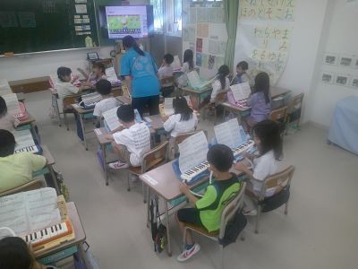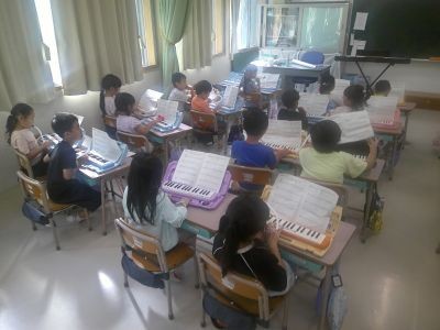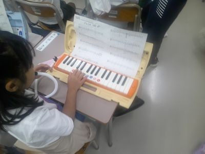 1年生が鍵盤ハーモニカを使った学習を行っていました。みんなで練習していたのは「ドレミの歌」。自分で繰り返しがんばる子、友だちにアドバイスする子・・・。息の使い方も少しずつ身に付いてきているようでした。