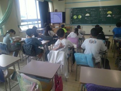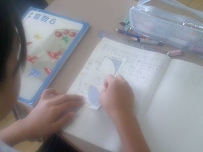 6年生の習熟度別の算数の一つのコースを参観しました。円の面積の学習です。半円と直角三角形を組み合わせた図形の面積の求め方についての学習。どうやって指定された場所の面積を求めればよいか、子どもたちはあれこれ考えノートにまとめるなどしていました。自分はどのように考えたのかを自分の言葉で説明できることが大切です。難しさを感じながらがんばっていた子どもたち。その図がどんな形の組み合わせなのかを考えることがポイントであることを学んでいました。