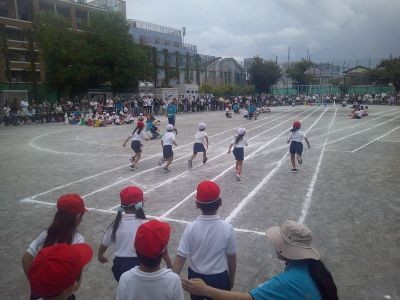 初めての運動会、スポーツフェスティバルの1年生。思い切り走り、楽しく踊りました。1,2年生合同の玉入れもみんな笑顔でがんばりました。