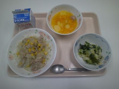 献立は、ペッパーポークライス、わかめサラダ、紅白フルーツ白玉、牛乳でした。