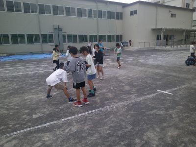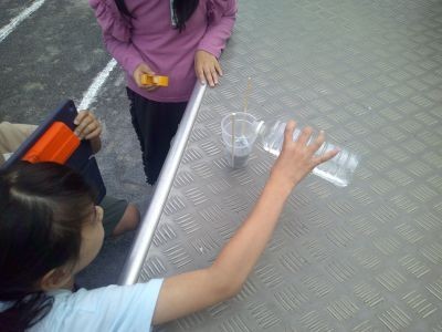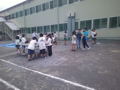水のしみ込み方は土の粒の大きさによって違いがあるのか。4年生の理科です。実際に校庭に出て、粒の大きさが違う土をカップに入れ、その上から水を入れてしみ込み方を記録していました。雨水の行方と地面の様子にかかわる学習です。