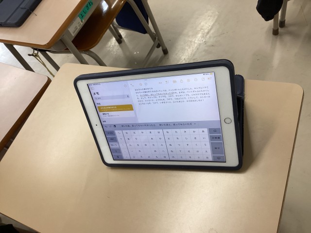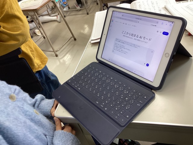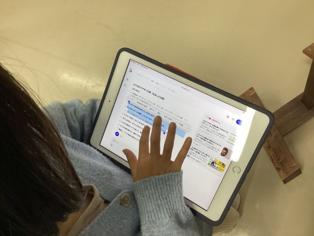 ノートに書き、友達にアドバイスをもらいながら進める子。タブレットに入力し、AIにアドバイスをもらいながら進める子。各々やりやすい方法を選びながら進めています。