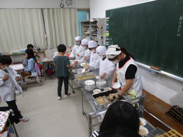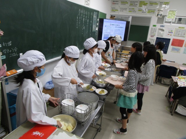 写真は2年1組の給食準備風景。給食の準備がとてもスムーズに進んでいました。