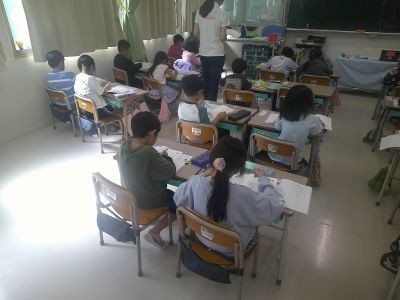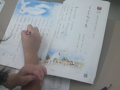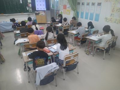 1年3組の国語の授業を参観しました。「くじらぐも」というお話を読む1時間目です。今まで読んだ物語文とそのときの学習を振り返るところからスタート。次に担任の朗読に沿いながら、初めて出てくる漢字の読み方を確かめました。漢字の読み方もわかったところで子どもたちと担任が一緒に読んでいきます。「くじらぐも」での新出漢字は9つ。一つ一つを確認しながら、お話を聞いたり声に出して読んだりして内容の大体をつかみました。これから詳しく読んでいきます。